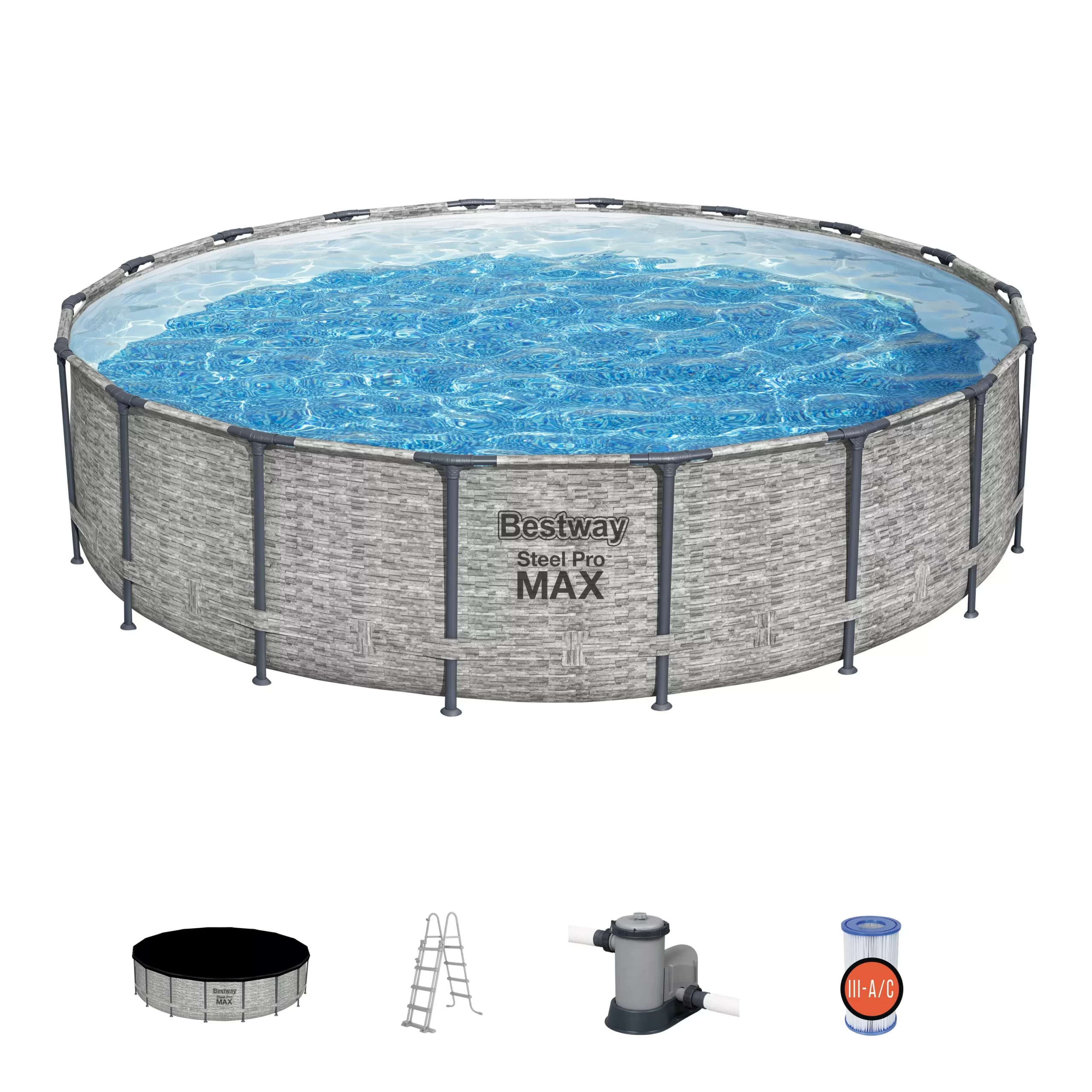 It doesn’t get any better than having your very own pool in your backyard! The Bestway® Steel Pro MAX™ Above Ground Pools offer an ultra durable option at a great price. Durable Construction: The corrosion-resistant steel frame is equipped with our FrameLink System™ for a sturdy and secure frame connection. The protective connectors protect from damage and rust-causing metal-on-metal contact. They are also compatible with accessory attachment, such as cup holders. The sturdy DuraPlus™ liner is made out of an ultra-durable 3-layer material that is reinforced for strength and puncture-resistance. DuraPlus is 15% more tear resistant, 33% more stretch resistant and 83% more puncture resistant than standard PVC, ensuring your pool will last summer after summer. Additional Features: This above ground pool set also comes stocked with a filter pump, a safety ladder and a pool cover. The flip and lock ladder design prevents unsupervised access to the pool. Plus, this pool is very simple to set up and to take down for off-season storage. No tools are required, and a hose connects to the built-in flow control valve to quickly and easily drain away pool water. Spend your summer on the water in this Bestway Steel Pro MAX pool!