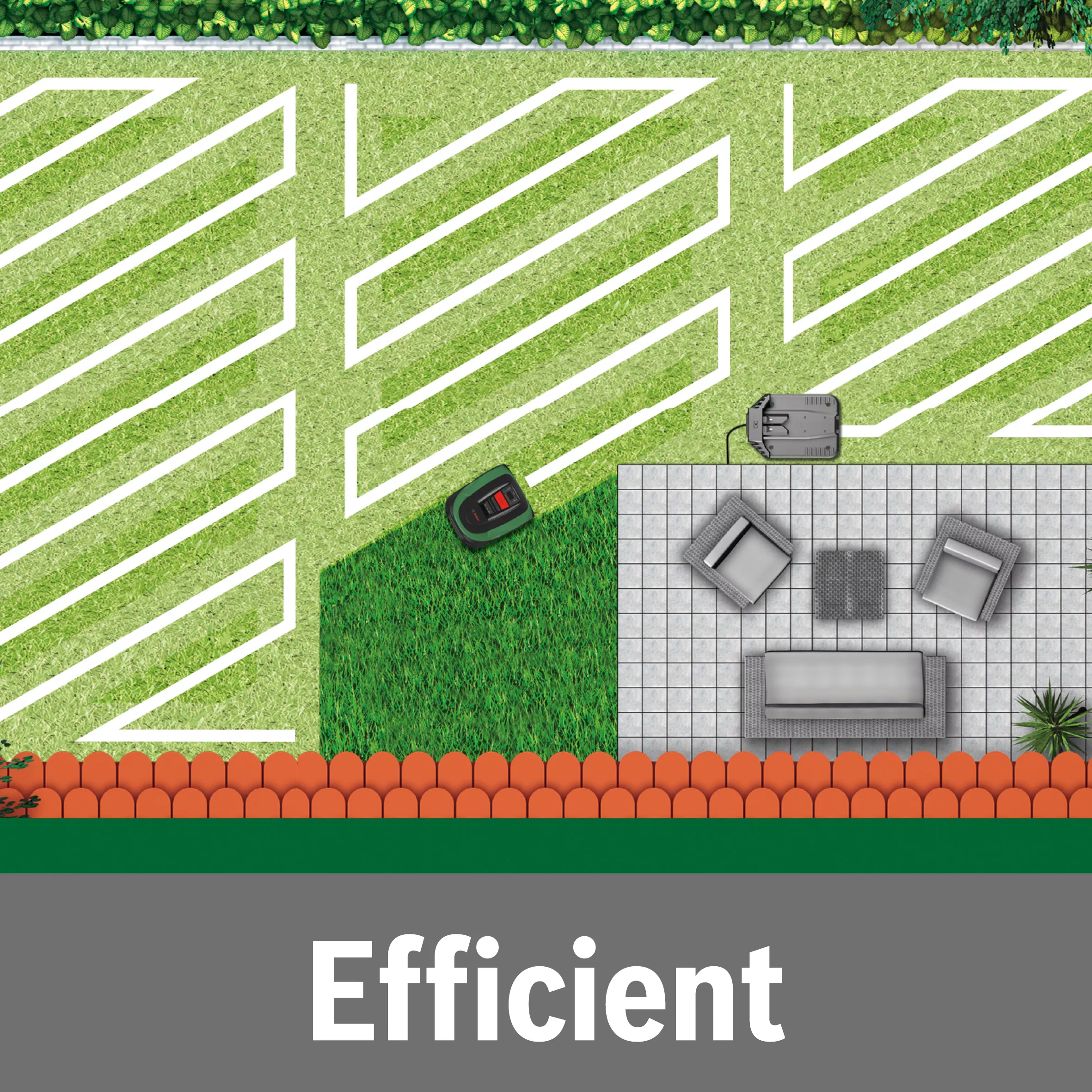 - LogiCut maps the lawn and cuts in efficient parallel lines