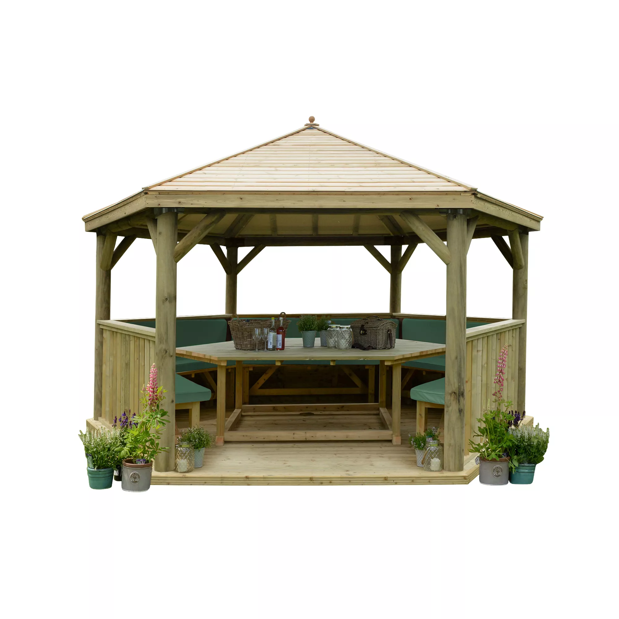 - The 4.7m Furnished Hexagonal Wooden Garden Gazebo with Timber Roof is perfect for outdoor dining