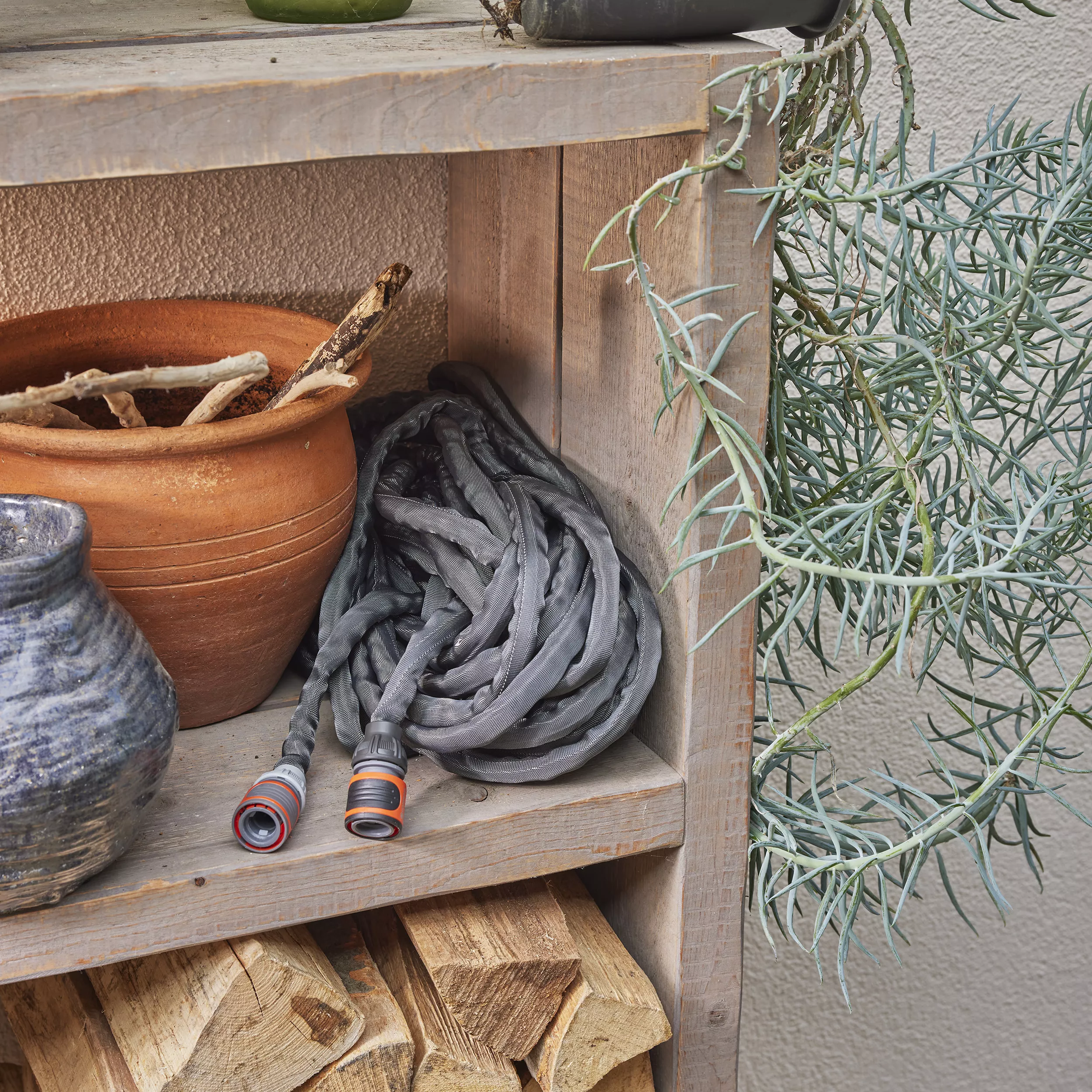 The Textile Hose Liano™ Life 20 m Set from Gardena is for perfect for immediate use and suitable for short and medium duration irrigation, in medium-sized gardens. The set includes a 20 m long Liano™ Life hose, with a diameter of 13 mm (1/2″), pre-assembled Original Gardena System parts, a Liano™ Hose Connector and Liano™ Water Stop, a Cleaning Nozzle and two Tap Connectors.