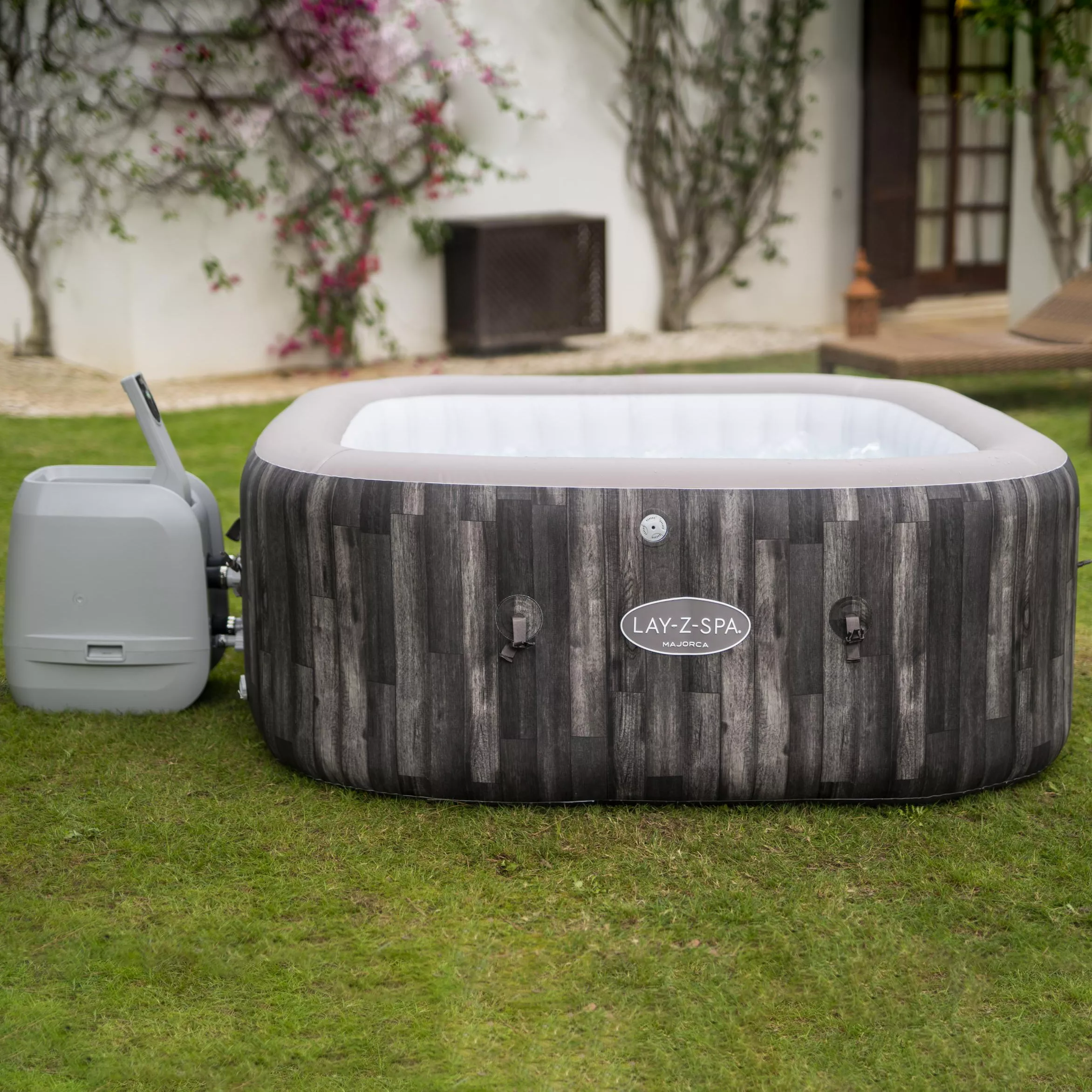 The Lay-Z-Spa® Majorca HydroJet Pro™ has a cosy square design with a stylish wooden print and is a great place for entertaining friends and family or providing blissful tranquillity. Up to 6 people can indulge in the blissfully relaxing HydroJet Pro™ massage system that incorporates 140 all-surrounding AirJets™ and 8 adjustable and multi-directional HydroJets™ that are designed to help you relax in optimum comfort. Rapidly heating to 40°C and with a desirable power-saving system, this rejuvenating spa is guaranteed to impress. Pioneering Freeze Shield™ technology provides protection throughout the winter months, the insulating lid and top cover help with further heat retention and the power-saving timer helps prevent unnecessary energy use. The Majorca HydroJet Pro™ has a tough, comfortable and highly durable DuraPlus™ material and beam construction for rigidity, stability and longevity. This Lay-Z-Spa® is completed with advanced safety features, an external pump with adjustable digital control panel and drinks holder plus an integrated filter holder and practical ChemConnect™ dispenser for easy maintenance. Everything you need except chemicals is included in the box. We recommend ClearWater® Chemicals.