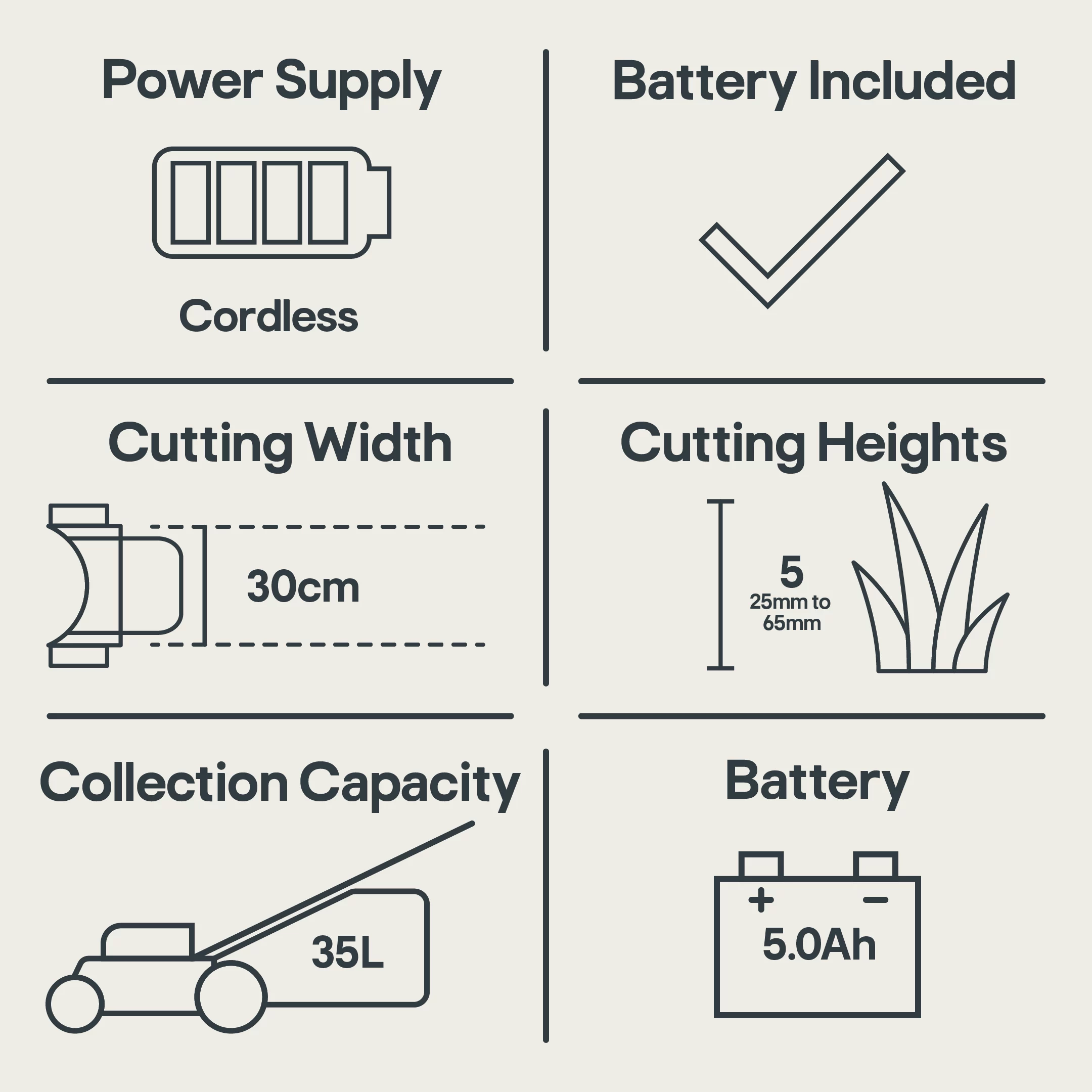 - Comes with 1 x 5.0Ah 18v battery, 1 x 2.0A 18V battery charger, 1 x mulching plug, 1 x 35L grass catcher