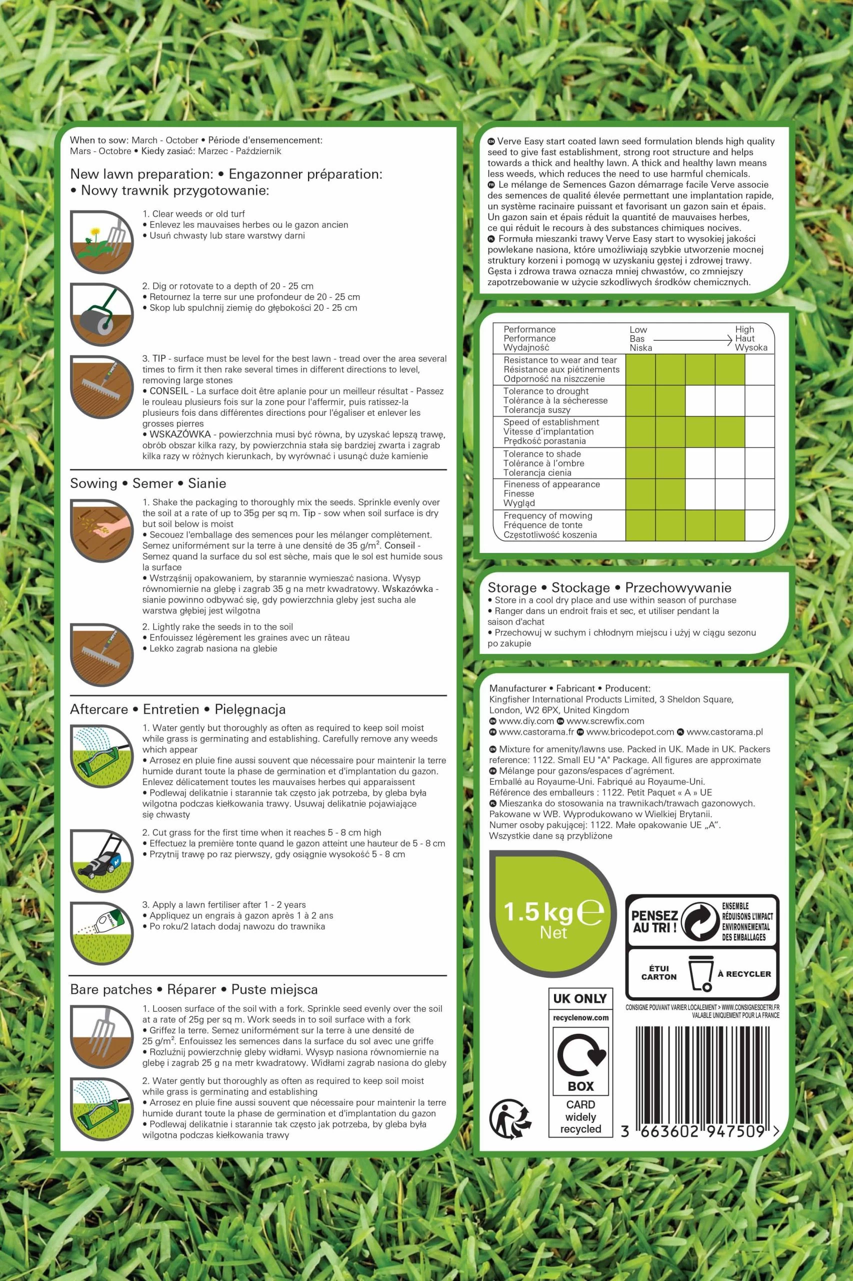 | Instructions for use | Clear weeds or old turf. Ensure roots of perennial weeds are completely removed. Dig or rotovate to a depth of 20-25cm. Tread over the area several times to firm it then rake several times in different directions to level, removing any large stones. Apply pre-turf fertiliser to the surface and lightly rake in. Shake the packaging to thoroughly mix the seeds. Sprinkle evenly over the soil surface at the recommended sowing rate. Ideally the soil surface should be dry but the soil below moist. Lightly rake the seeds in to the soil. |