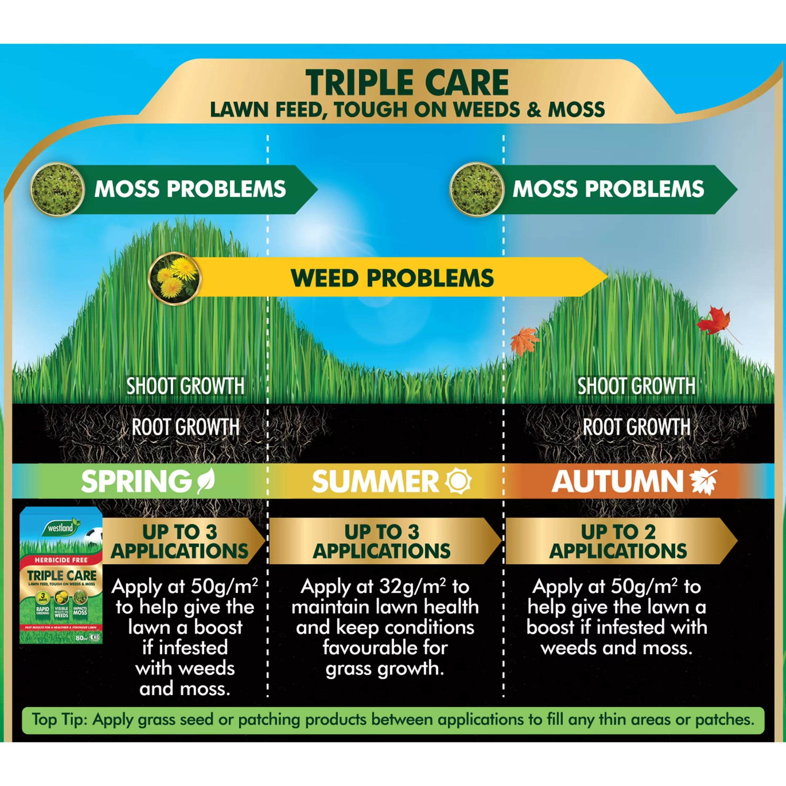 - Apply every 3-4 weeks from February to October when grass is actively growing. For use on established lawns (3+ months old). For best results allow the lawn to grow for 3 days before treatments and retreat 2 weeks after initial application. Apply when the soil is moist and the grass is dry. Do not use during drought, freezing or windy conditions. Apply the granules thinly and evenly to ensure the same result across the entire lawn. Mark out the areas to be treated. The standard application rate is 32g/m2. However, in early spring and autumn the rate of application can be increased to 50g/m2 to help give the lawn a boost if infested with weeds and moss.